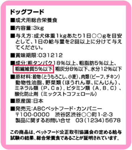 このようにペットフードでは食物繊維は「粗」繊維としてパッケージに表示されますが、粗繊維=食物繊維ではありません。