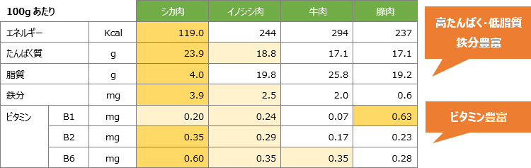 ジビエは牛・豚と比較し、高たんぱくで低脂質、鉄分が豊富といった点から注目されています。特にシカ肉は低脂質のため、脂が多いと不適であるペットフードの原料にも適しており、ジャーキー、総合栄養食やウェットフード等、さまざまなペットフードに活用されるのを見かけるようになりました。