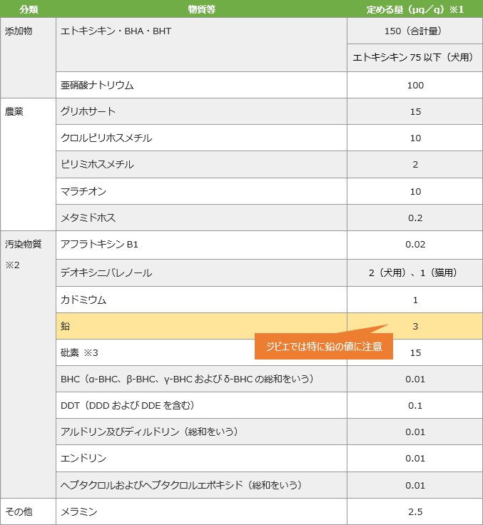 ※2 ペットフード安全法では、ペットフード中の鉛の上限値(3μg/g)が設定されています。