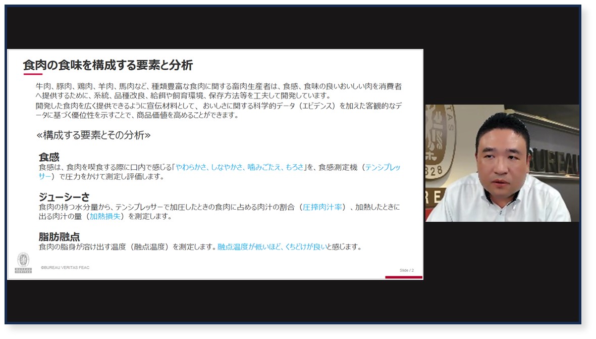 後半は弊社より、食事の「質」にも影響を与えるとされる食品の「おいしさ」について、指標のひとつとなる食品の構成する要素を科学的分析する評価方法をご紹介しました。